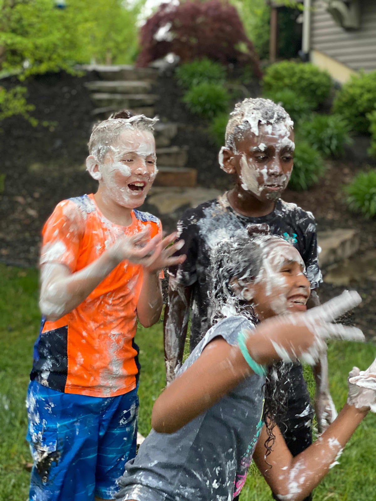 The Lower Elementary at Oak Farm has a tradition at the end of every school year to do Messy Games. The third graders come up with the game ideas and they go to station after station of messy races and games. With "homeschool" happening, messy games had to also move to home. So we participated :-)